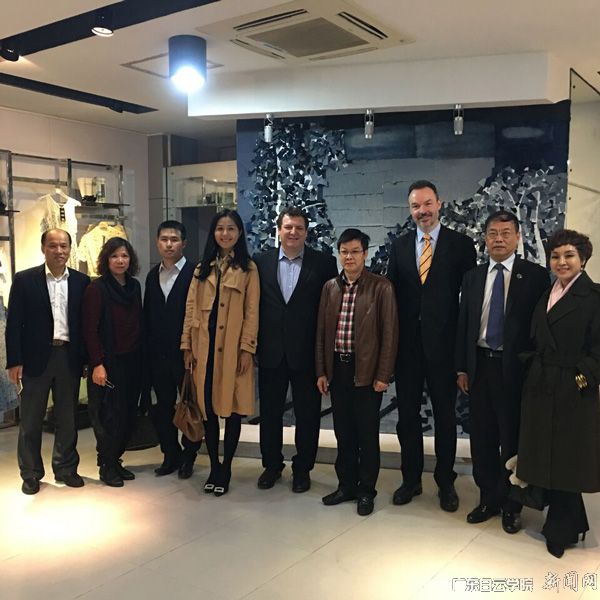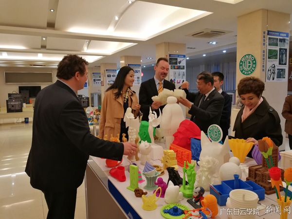 我校董事长谢可滔亲自陪同来宾参观西校区新建的复合材料应用创新训练中心和艺术设计学院展厅,强调我校校企合作的办学特色和以培养应用型人才为导向的办学目标。阿富廷博士对我校的应用型办学方向高度赞赏,对学生设计作品赞叹不已。