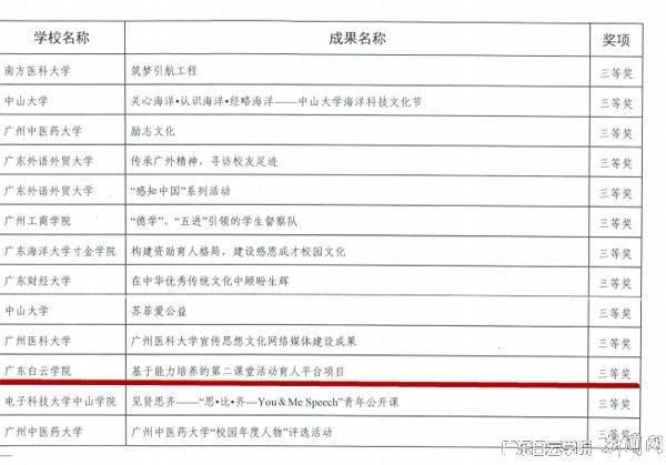 近日,从《广东省教育厅关于公布2016年广东高校校园文化建设优秀成果的通知》中获悉,我校项目《基于能力培养的第二课堂活动育人平台项目》获得2016年广东省高校校园文化建设优秀成果(本科组)三等奖。