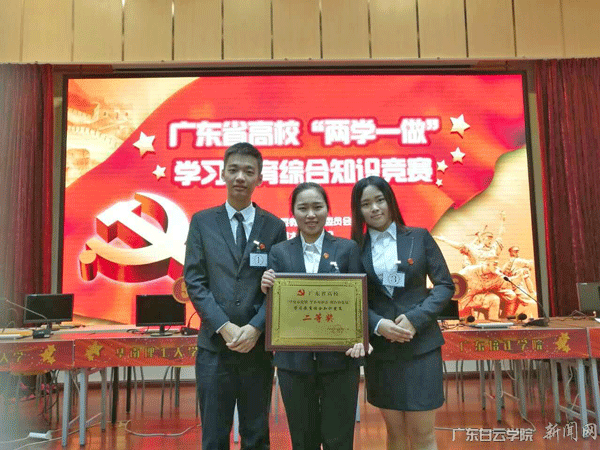12月15日,华南师范大学石牌校区教育信息技术学院一楼讲学厅座无虚席,广东省高校“两学一做”综合知识竞赛在此隆重举行。我校建筑工程学院肖杨杨老师、外国语学院林显锐同学、财经学院陈洁玟同学组成一个参赛队伍代表广东白云学院参赛。经过15日上午的初赛包括个人必答、团队抢答、抢答复活三个环节,成功晋级下午的决赛。决赛设团队必答淘汰、风险选择两个环节。经过激烈而惊险的角逐,三位选手沉稳应战,最终脱颖而出,获得了二等奖。这充分展示了我校师生党员的风采,也是我校扎实推进“学党章党规 学系列讲话 做合格党员”学习教育工作取得的又一佳绩。