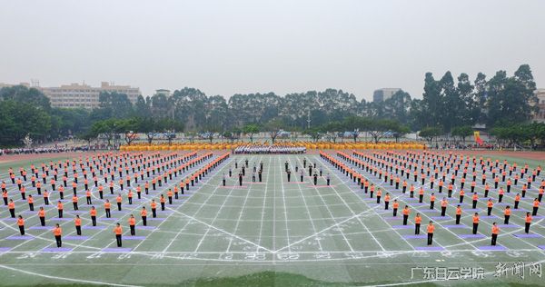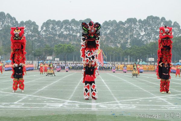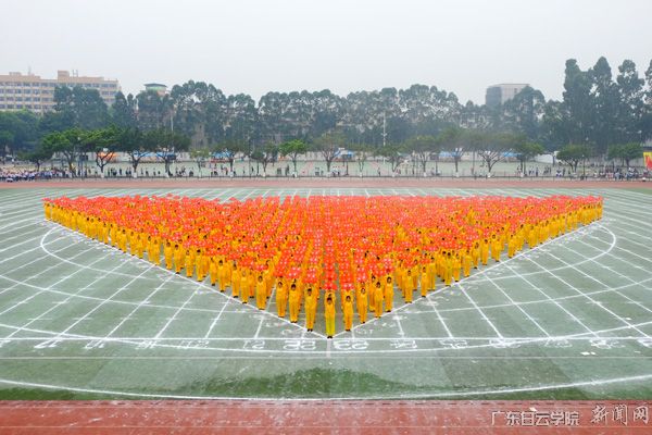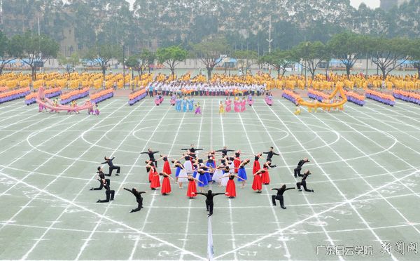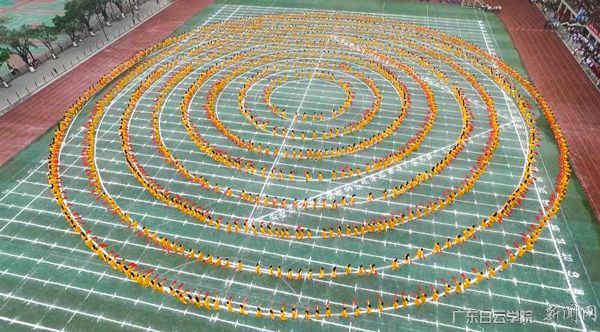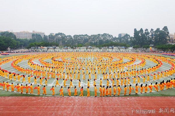 而激动人心的则非开幕式文艺表演莫属。在激昂雄浑的音乐声响起时,在章海森、黄小津两位同学热情、动人的解说进行时,师生瞩目、众人期盼的《逐梦白云》系列文体艺术节目闪亮登场,标志着运动会开幕式进入高潮。(1)传统体育龙狮表演(指导老师李东彪、张林)首先亮相,来自龙狮团和武术俱乐部的健儿们敲响了喧天锣鼓,绿茵场上,只见龙腾狮跃、拳打脚踢、凤凰展翅、刀来枪往,演绎出了一幅幅威风凛凛、大气磅礴的龙风狮姿。(2)啦啦操表演(指导老师郭晓静)则欢快灵动,充满现代韵味,将一群身姿矫健、青春靓丽的少男少女们健康活泼的形象直观而鲜活地呈现给我们。(3)体育舞蹈表演(指导老师吴小丽)为大家带来了拉丁舞与摩登舞的国标式演出,热情的恰恰、欢快的牛仔、激烈的斗牛和柔情的伦巴,还有热烈狂放的探戈、加上华丽优雅的华尔兹,来自校体育舞蹈队的俊男美女们为师生奉献了一场名副其实的视觉盛宴。(4)在悠扬舒缓的背景音乐映衬下,瑜伽协会(指导老师郭晓静)献上了属于他们的“青花瓷”,400多名演员展示了动与静、淡与雅、刚与柔的完美结合,优雅的动作、婀娜的形体,让师生们仿佛进入了瑜伽梦幻般的世界。(5)军训教导大队400余人表演的“白云魔方”(指导老师戴立新),上百个旗语动作整齐划一、干脆利落,演绎了“0”到“9”数字传奇,不是动漫胜似动漫,不着军装亦有军魂,他们带来的视觉冲击一样惊艳全场。(6)压轴好戏是“千人太极”(体育教研室教师集体指导)。1100余名2016级白云学子伴音而起、随声而定,动而不急、急而不躁,进退有序、聚散有度,将“白云”扇的挥舞与太极运动的灵巧完美融合,那一声声的“唰”、那一道道的“环”,急缓相间、行云流水,是中华太极文化在白云的精彩演绎!