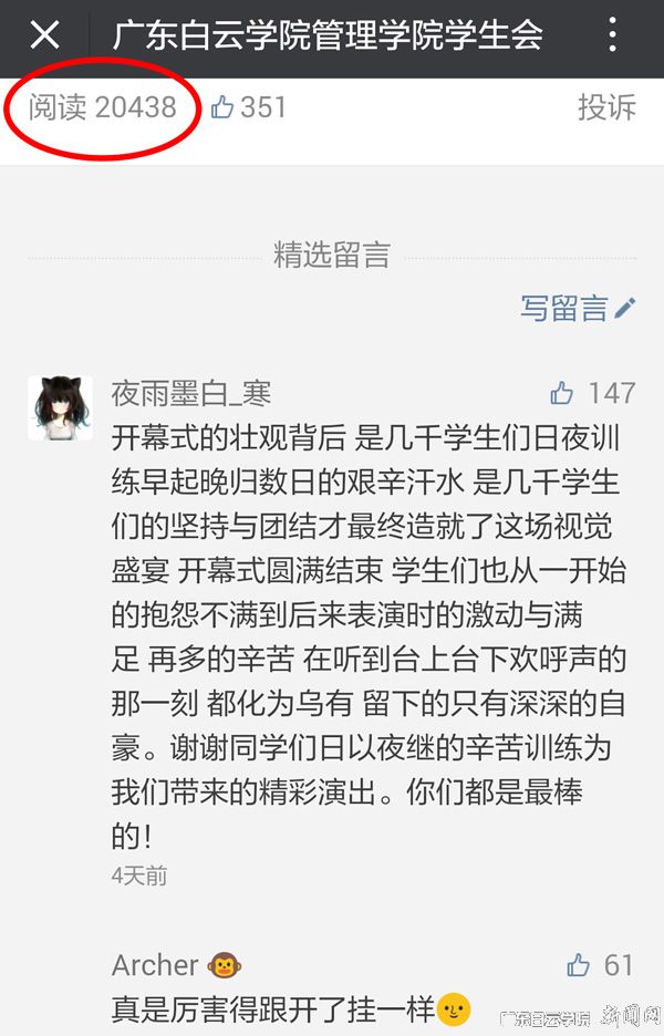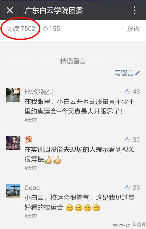 据统计,校运会现场加油稿投稿量超过两万篇,全校新媒体平台共推送了60余篇有关校运会的报道,受到热烈的追捧。例如“在我眼里,小白云开幕式质量真不亚于里约奥运会,今天真是大开眼界了”、“小白云,校运会真的很霸气,这是我见过最好看的校运会”、“在实训周没能去现场的人表示看到视频很震撼”、“这么完美的运动会,很棒!”“真是厉害得跟开挂了一样”等微信文章受到了热烈追捧,学校师生和社会各界人士纷纷点赞及留言。由学生团队进行的开幕式网络直播,在开幕式当天点击率就高达600余人次。(学生处王晓艳、马海停供稿,办公室胡小锐整理)