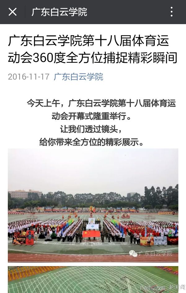 11月17日上午,广东白云学院以“努力拼搏,放飞梦想”为主题的第十八届校运会在西校区运动场隆重开幕,开幕式上龙狮表演、啦啦操、体育舞蹈、瑜伽、白云魔方和千人太极扇表演等节目惊艳全场。节目参与人数多,表演形式新颖,组织编排巧妙,引起了学校师生及社会各界人士的广泛好评。开幕式图片及视频经学校各级各类网络平台宣传,一天之内点击量突破7万人次,创历史新高。