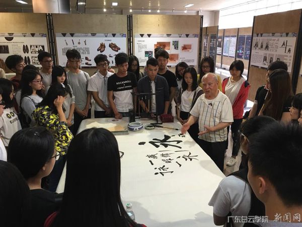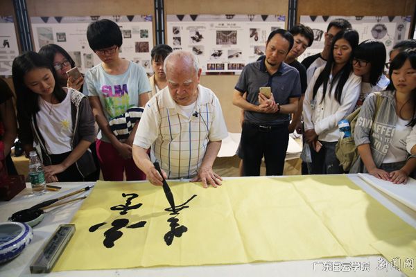 92岁高龄的梁老先生在德艺楼展厅现场挥毫示范并传授书画知识两个半小时,吸引了众多师生前来观摩学习。大家先从屏幕上欣赏梁会长近期作品,作品侧重岭南风格,用笔简劲朴茂,笔力沉雄,而又锦绣内蕴、飞龙走蛇,是一幅幅神采焕发的佳作。随后,梁炯熏会长现场挥毫泼墨,进行即兴创作,在创作的同时,梁会长还和同学们进行互动,回答了同学们有关书画笔法、章法等方面内容的问题。除此之外,他还将现场创作的作品赠予学校师生,将交流活动推向了高潮。师生众口同声:“老人厉害!身体硬朗,功底深厚,都是第一次亲身目睹高龄书画家现场挥毫,受益匪浅!”