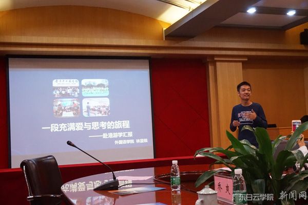 下午,外国学院和国际学院党总支书记朱玲主持了2016年穗港青年文化交流活动汇报会。在会上,首先播放了本次活动的总结视频,5位学生代表发言并分享了他们的心得体会。第一位发言的是外国语学院的林星辰同学,她以故友重逢开头,认为此次交流活动是一次慈善之行,要牢记感恩爱国;随后,财经学院的罗绵宜同学认为参观香港交易所展览馆是他此行最大的收获;接着,外国语学院林显锐同学从香港与内陆发展的异同出发,希望香港与祖国能多加强青年之间的沟通与交流;之后,广州市白云工商技师学院的徐乐豪和王子茹同学,分享了他们自己的学生干部三自教育,即自我管理、自我服务、自我教育;最后是管理学院的林敏妍同学,她认为佛教筏可纪念中学的学生每天唱两次国歌是香港游学之行最让她感动的。