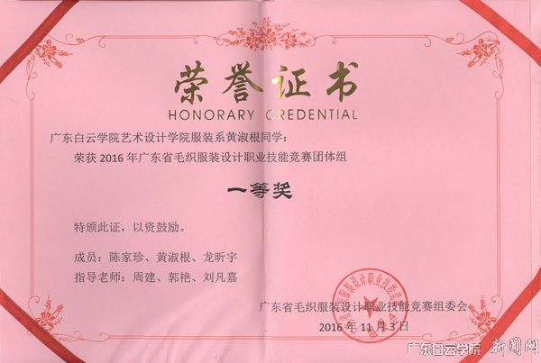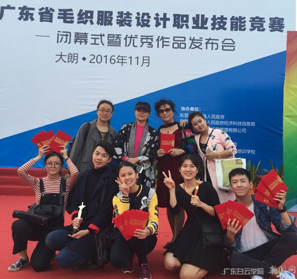 11月3日,2016年广东省毛织服装设计职业技能竞赛在大朗落幕,广东白云学院艺术设计学院2014级服装设计与工程专业陈家珍、黄淑根、龙昕宇三位同学荣获团体组一等奖,2015级产品设计专业(服装设计方向)陈建达、李玉翠、吴妍珊三位同学荣获团体组二等奖,服装系郭艳老师、周建老师、刘凡嘉三位老师荣获优秀指导老师奖。
