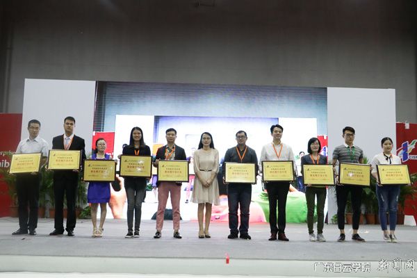 广东白云学院学生设计作品展荣获中博会最佳展厅设计奖,图为我校艺术设计学院院长助理方建松(右五)作为获奖代表上台领奖