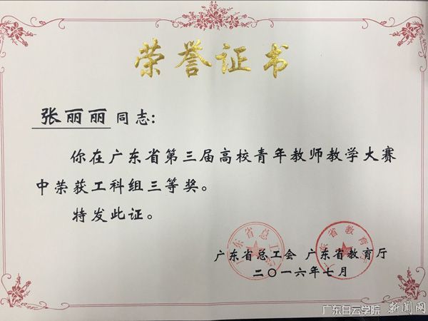 近日,从《关于公布广东省第三届高校青年教师教学大赛结果的通知》(粤工总〔2016〕18号)文件得知,我校机电工程学院张丽丽老师在比赛中荣获工科组三等奖,我校荣获大赛优秀组织奖。