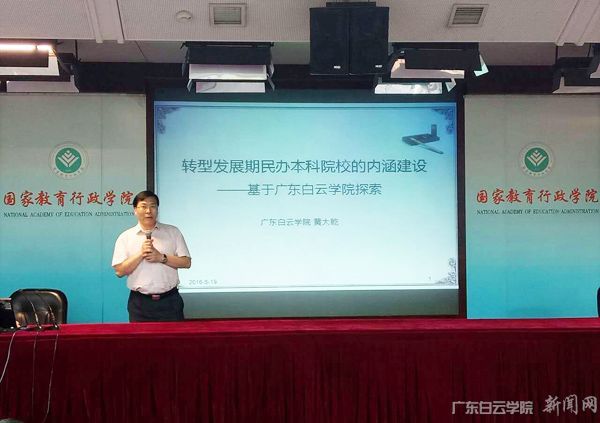 5月19日,广东白云学院校长黄大乾教授在国家教育行政学院演讲,与来自全国各地的民办高校校长班的学员们共同分享了我校在国家引导地方普通本科高校向应用型转变,以更好地服务经济社会转型升级对高级应用型人才需要的大背景下建设高水平应用技术大学的经验和体会。
