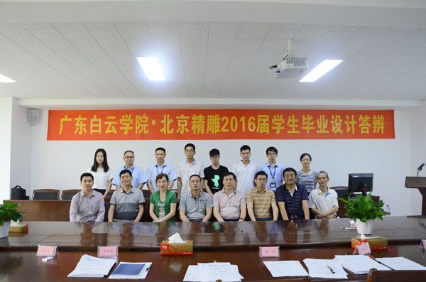 4月27日下午,广东白云学院机电工程学院2016届毕业生毕业设计公开答辩在北京精雕东莞分公司举行,广东白云学院校长黄大乾、实践教学中心主任张国安、机电工程学院副院长曹玉华、院长助理李林、北京精雕东莞分公司总经理黄波及总工程师江海等校企领导出席了此次答辩。来自机电工程学院的曾韬等四名同学进行了毕业设计的公开答辩。