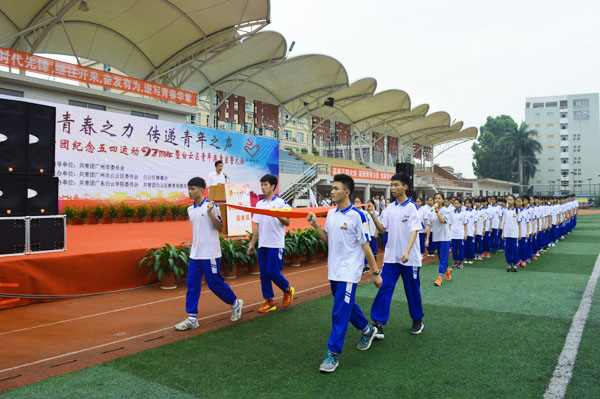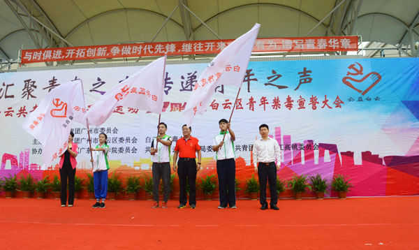 为纪念“五四”运动97周年,进一步引导和激励广大青年学生继承和弘扬“五四”精神,同时向青年学生宣传毒品的危害,号召大家远离毒品,5月4日,由共青团广州市委员会、共青团广州市白云区委员会、白云区禁毒办、共青团白云区教育局委员会、共青团白云区江高镇委员会、共青团广东白云学院委员会联袂举办的的纪念“五四”运动97周年暨青年禁毒宣誓大会在广东白云学院西区运动场隆重举行。莅临现场的嘉宾有团省委权益部部长潭杰、团市委秘书长王晓杰、白云区人大常委会副主任徐晓兵、白云区副区长卢绮文、白云区关工委常务副主任麦沛贤、白云区禁毒办副主任王立新、团区委靳迪书记、全国道德模范赵广军、白云区自愿戒毒医院董事长慕东泰以及广东白云学院党委副书记李纯英等,白云区20多所学校近千名学生代表参加了大会。