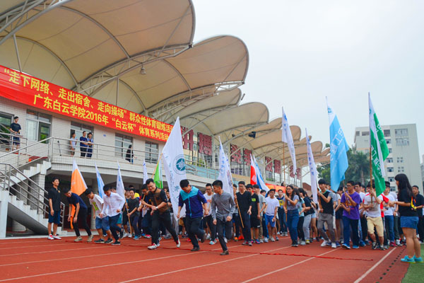 4月11日下午,由广东白云学院基础部、学生处、校团委主办,体育教研室承办,学生会体育部协办的大学生“走下网络、走出宿舍、走向操场”主题活动暨2016年“白云杯”体育系列比赛开幕式在西区运动场隆重举行。校团委副书记张泽彬、校团委副书记段立、体育教研室主任易志成老师、部分体育教研室老师、各二级学院团总支书记出席了此次活动。