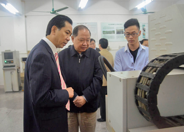谢可滔董事长(左一)陪同来宾参观我校精雕数控实验室