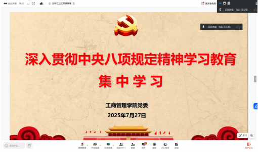 7月27日晚,工商管理学院党委以线上形式召开深入贯彻中央八项规定精神学习教育集中学习会,深入学习习近平总书记在中央政治局第二十一次集体学习时的重要讲话精神以及7月7日至8日习近平总书记在山西考察时的重要讲话精神。工商管理学院党委领导班子成员、各党支部书记以及全体师生党员参加会议,会议由学院党委书记刘华兰主持。