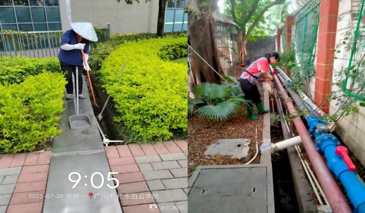 环境整治是防控蚊媒传染病的首要任务,“清积水”是关键环节。学校组织开展“地毯式”清积水行动, 对教学楼、学生宿舍、教师公寓、办公区周边、公共楼道、绿化带、下水道、沙井口、天台排水口等区域,进行全面排查清理。重点清除各类闲置容器、花盆托盘,疏通排水沟渠,确保无积水死角。加强景观水池、消防水池等水体监控,采取定期换水和投放药物防制措施。