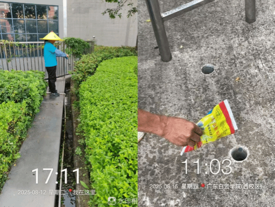 学校构建“监测+防护”双重防护网,已在室外重点区域布放蚊媒监测器具8个,安装太阳能灭蚊灯43台,并向暑期上班单位人员发放灭蚊片、驱蚊液等防护物资;聘请第三方专业消杀团队,对校园下水道、绿化带、宿舍及教学楼周边等蚊虫易滋生和栖息的重点区域实施全覆盖灭蚊作业,针对草丛、垃圾站等蚊虫密集区域加强喷药频次。此外,学校建立“专业化、常态化”的物业消杀队伍,配备器械物资,开展技能培训,切实提升校园疫情防控能力。