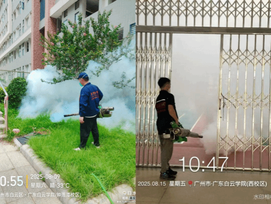 8月13日白云区教育局陈秀贞总督学一行5人实地督导检查北校区“两热”疫情防控工作。检查组通过实地查看、查阅台账、现场问询等方式,全面了解我校疫情防控措施落实情况,重点查看了校园防控管理、四害消杀台账及物资储备情况,对我校科学、精准、高效的防控举措给予充分肯定,并给出了指导意见。8月15日,学校组织参加全省教育系统疫情防控暨安全稳定工作视频调度会并会后及时传达会议精神,发布《广东白云学院关于开展2025年秋季学期爱国卫生运动暨做好“两热”防控工作的通知》细致部署安排开展开学前后爱国卫生运动,认真做好“两热”及其他秋冬季传染性疾病的防控工作。8月19日钟落潭镇指导组由征地办邹月琴主任带队指导北校区“两热”疫情防控工作。8月20日市指导组王志伟副主任一行3人来校督导西校区“两热”疫情防控工作,对两热疫情防控的责任落实、环境卫生整治、灭蚊消杀、联防联控等工作提出具体指导意见。