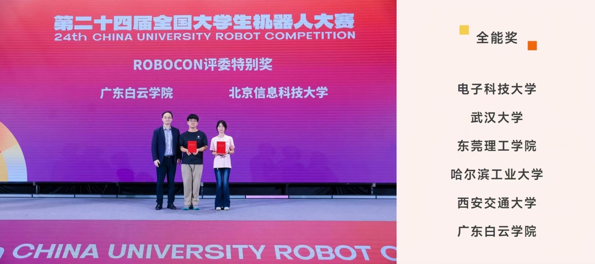 近日,第24届全国大学生机器人大赛ROBOCON在香港中文大学(深圳)圆满落幕。首次参赛的广东白云学院机器人队表现卓越,荣获多项大奖,包括“飞身上篮”机器人投篮技能赛全国一等奖、“飞身上篮”机器人运(传)球技能赛全国二等奖、“飞身上篮”机器人篮球技能赛全能奖、“飞身上篮”机器人篮球竞技赛全国二等奖,以及仿真足式机器人竞速赛、越野赛、障碍赛全国三等奖。队伍共摘得8项国家级奖项,涵盖一等奖1项、二等奖2项、三等奖3项、全能奖1项及评委特别奖1项,以出色的首秀为学校赢得荣誉。