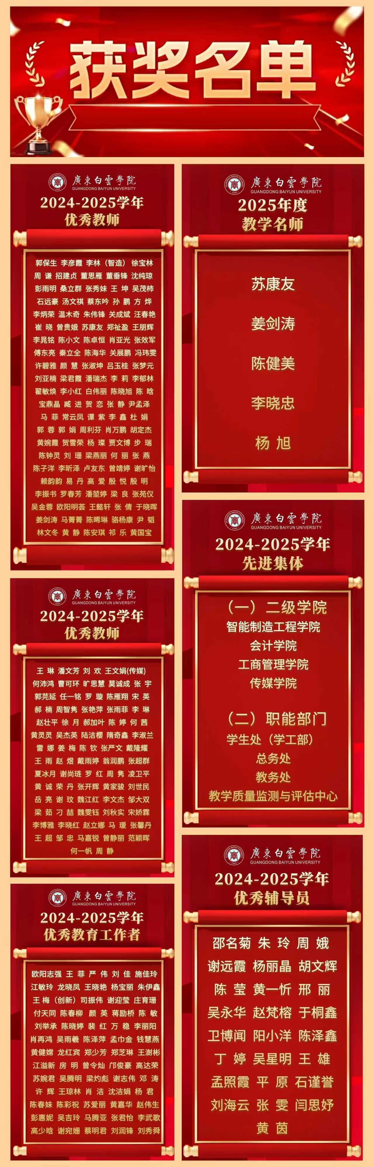 党委书记孙国忠首先宣读了获得国家、省、市表彰(奖励)的单位与个人名单,以及学校教学、科研成果奖的获得者名单。这些荣誉获得者正是学校践行“以教育家精神铸魂强师”的生动典范,每一项荣誉的公布都赢得了现场教职工的热烈掌声。紧接着,副校长李红英宣读了《广东白云学院关于表彰2024-2025学年先进集体和先进个人的决定》,授予苏康友等2025年度“教学名师”荣誉称号,授予智能制造工程学院等单位(部门)2024-2025学年“先进集体”称号,授予李彦霞等“优秀教师”称号、授予邵名菊等“优秀辅导员”称号,授予欧阳志强等“优秀教育工作者”称号。