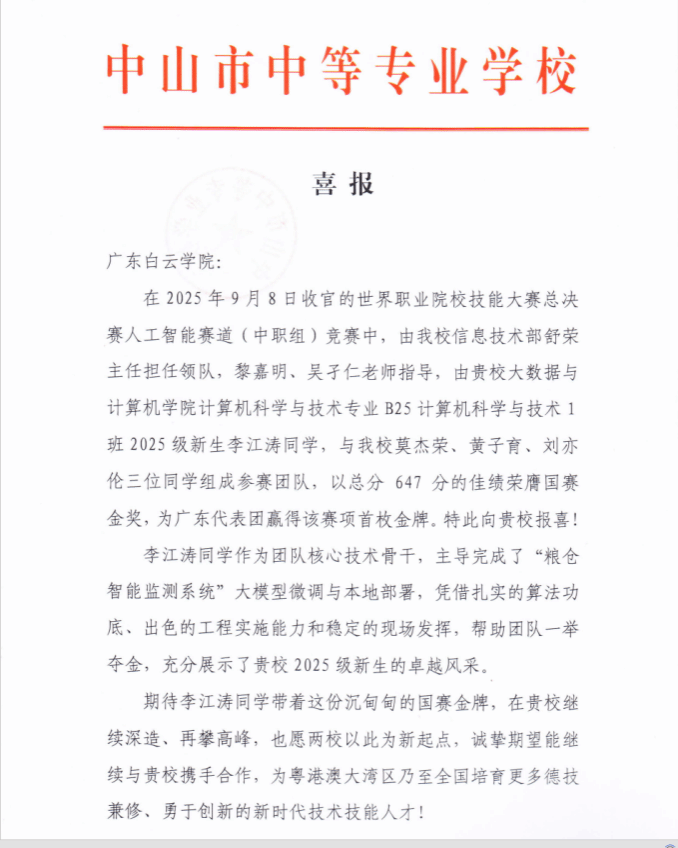 日前,广东白云学院大数据与计算机学院收到一封来自中山市中等专业学校的喜报。喜报称,由大数据与计算机学院B25计算机科学与技术1班新生李江涛作为团队核心技术骨干的参赛团队,在刚刚收官的世界职业院校技能大赛总决赛人工智能赛道(中职组)竞赛中,以647分的佳绩荣膺国赛金奖,为广东代表团赢得该赛项首枚金牌。
