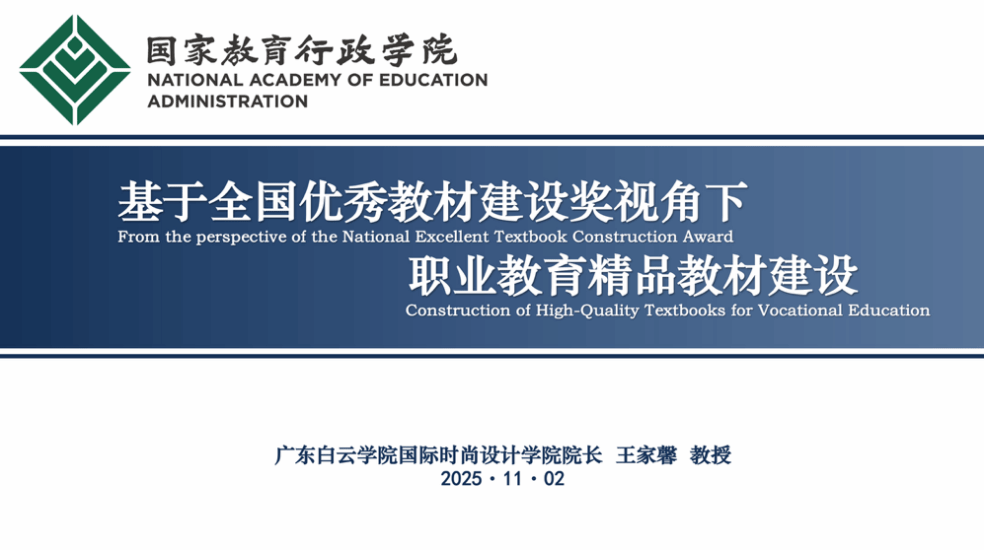 11月2日下午,广东白云学院国际时尚设计学院院长王家馨教授应邀在国家教育行政学院与中国教育干部网络学院作题为“基于全国优秀教材建设奖视角的职业教育精品教材建设”的专题报告。报告系统阐述了新时代职业教育教材建设的理念、路径与实践,围绕“培养什么人、怎样培养人、为谁培养人”这一根本问题,从政策导向、产业需求、科学原则与数字趋势等多维角度展开深入分析,为职业教育教材建设提供了理论支撑和实践指引。