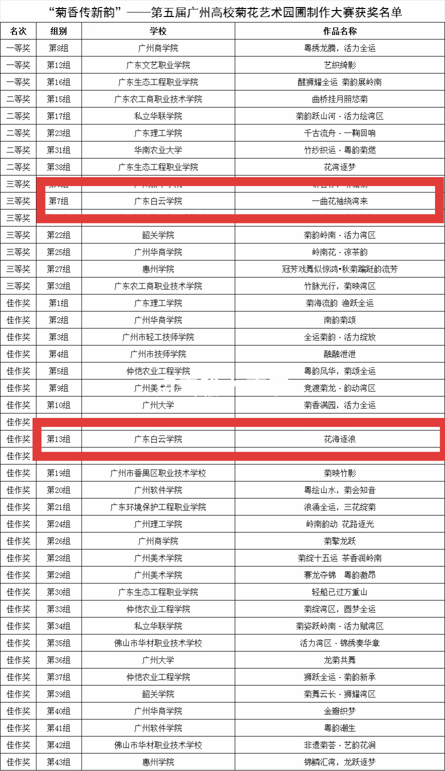 近日,以“菊香传新韵”为主题的第五届广州高校菊花艺术园圃制作大赛在广州文化公园圆满落幕。我校两支参赛队伍在建筑工程学院风景园林专业教师武欣、李珊、张伊的指导下,凭借作品《一曲花袖绕湾来》与《花海逐浪》,从全省高校40支参赛队伍中脱颖而出,分获三等奖与佳作奖。