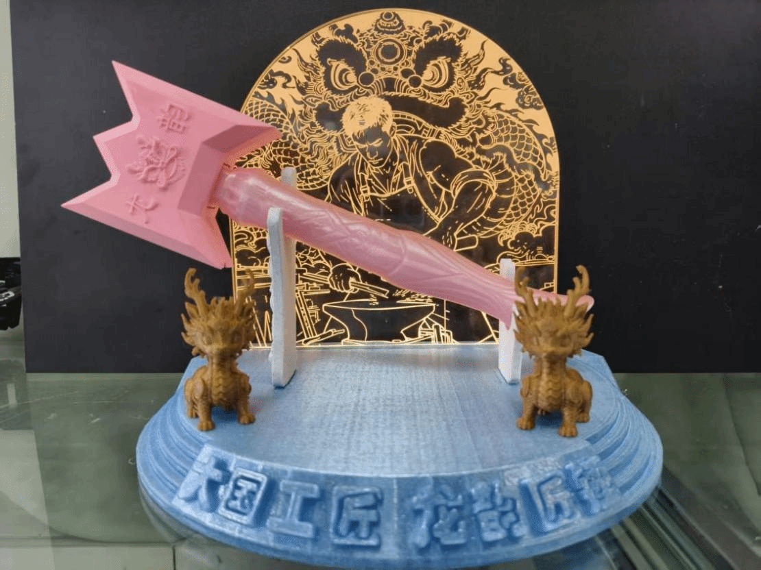 林家平小组的作品是:龙韵匠锤。作品将代表实干精神的钳工锤、锻炼锤成的火,与象征勇敢和力量的龙狮图腾有机结合,彰显了务实坚韧、勇敢探索、追求卓越的工匠精神。