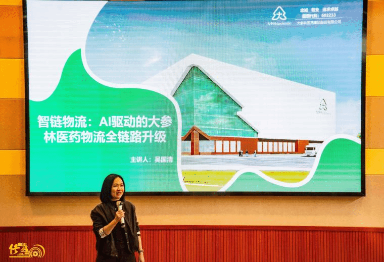 论坛正式开幕,进入到主题演讲环节。第一位主讲嘉宾是大参林医药集团股份有限公司物流中心总监吴国清女士,她演讲的主题是《智链物流:AI驱动的大参林医药物流全链路升级》。吴总详细介绍了大参林覆盖21个省份(自治区及直辖市)、支撑16833家零售药店、仓储面积超过38万平方米的“中央仓+省区仓+地区仓”为主的三级物流仓网体系,其“参林一号”仓通过AI全链路升级,实现高效智能运营,成为行业标杆。