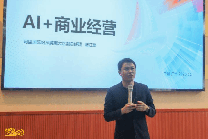 接下来是阿里巴巴国际站深莞惠大区副总经理、跨境出海资深专家陈江琪带来的主题演讲——《AI重构跨境未来:创业新机遇与职业新赛道》。陈总详细介绍了阿里巴巴在AI领域的战略布局:B端依托阿里云、通义Qwen3系列模型,开源300余款模型;C端推出千问App公测一周下载破千万,AI技术赋能电商、物流、医疗等多元场景。同时通过开源生态与基础设施出海,成为全球AI领域核心参与者。陈总说,AI时代下,我们都是与时间赛跑的人。不要让眼界与格局,限制未来的无限机遇!