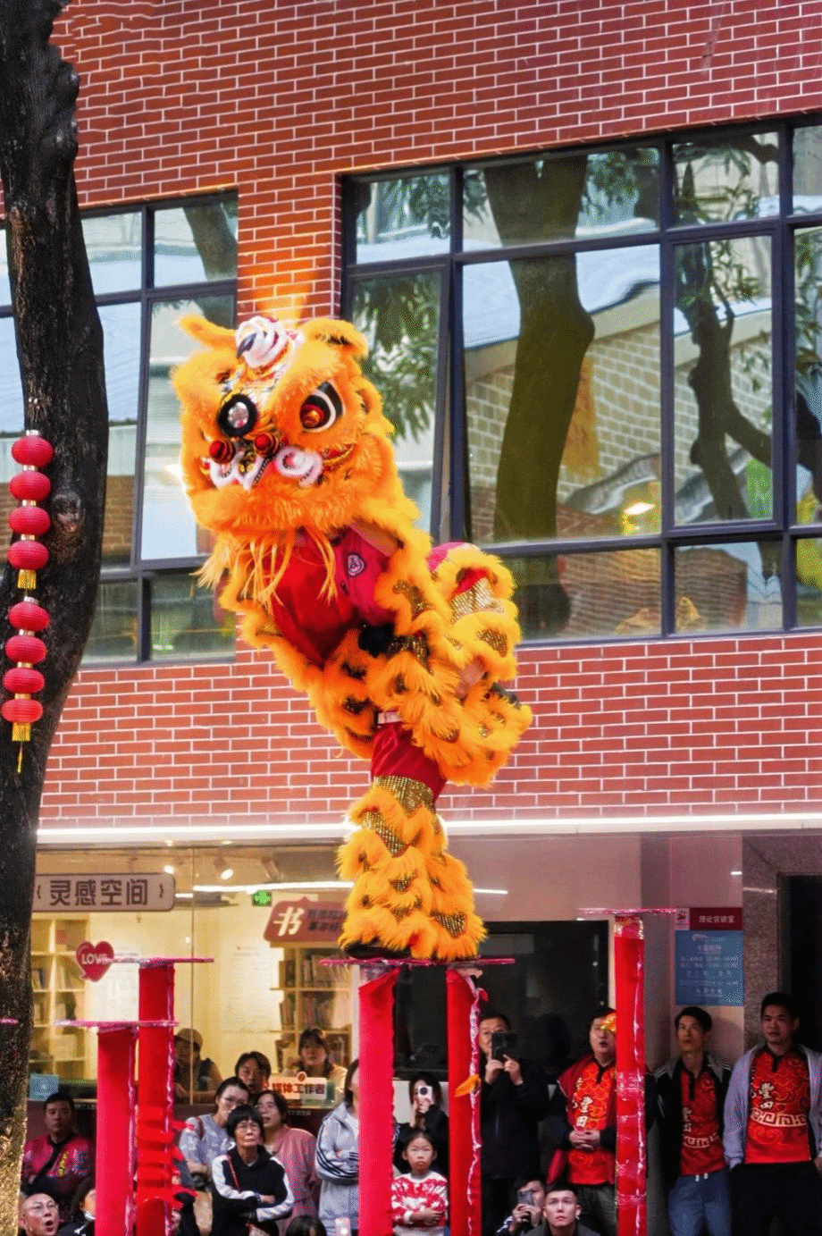 在高桩狮王争霸赛环节,我校教职工醒狮队与来自多个国家和地区的7支强队同台竞技。伴随着激昂的锣鼓节奏,队员们在高桩间腾挪跳跃、动作流畅有力,将醒狮的灵动与气势展现得淋漓尽致,赢得了现场观众的阵阵掌声。