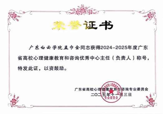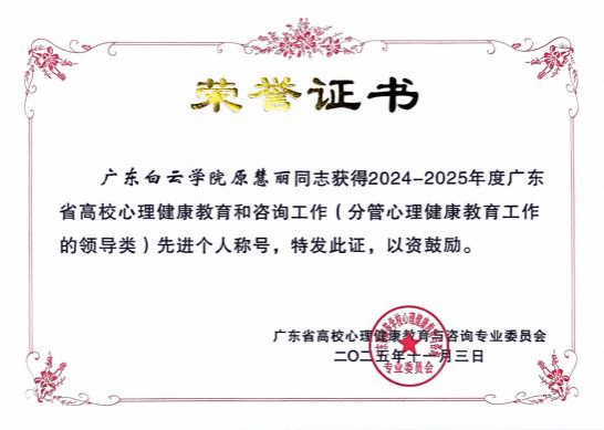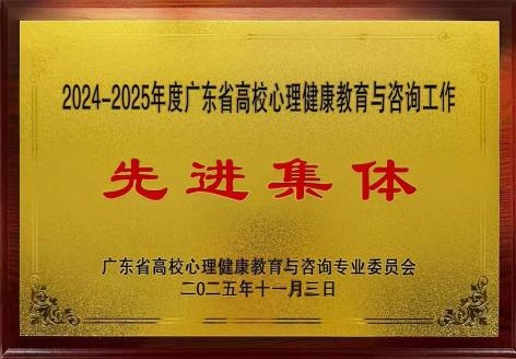 近日,广东省高校心理健康教育与咨询专业委员会正式公布2024-2025年度工作评优结果。经严格评审,广东白云学院心理健康教育与咨询中心凭借扎实的心理专业体系建设和显著的育人成效,荣获“广东省高校心理健康教育与咨询工作先进集体”称号。