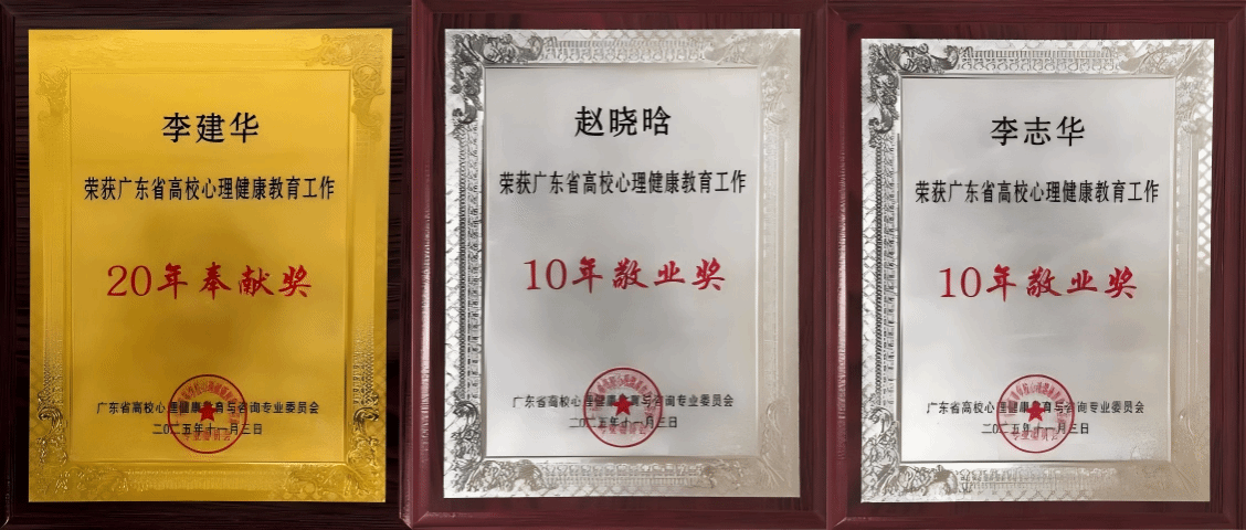 在此次评选中,我校心理中心教师及二级学院心理辅导站成员获得多项省级表彰,共获个人荣誉6项,科研成果3项,充分展现了我校心理育人工作的卓越成果与持续活力。其中,心理中心赵晓晗主任、教育学院李志华副书记因多年来的敬业付出,荣获广东省高校心理健康教育工作“10年敬业奖”;会计学院李建华书记更以几十年如一日的热忱奉献,荣膺广东省高校心理健康教育工作“20年奉献奖”,为我校心理健康教育工作留下深刻印记。