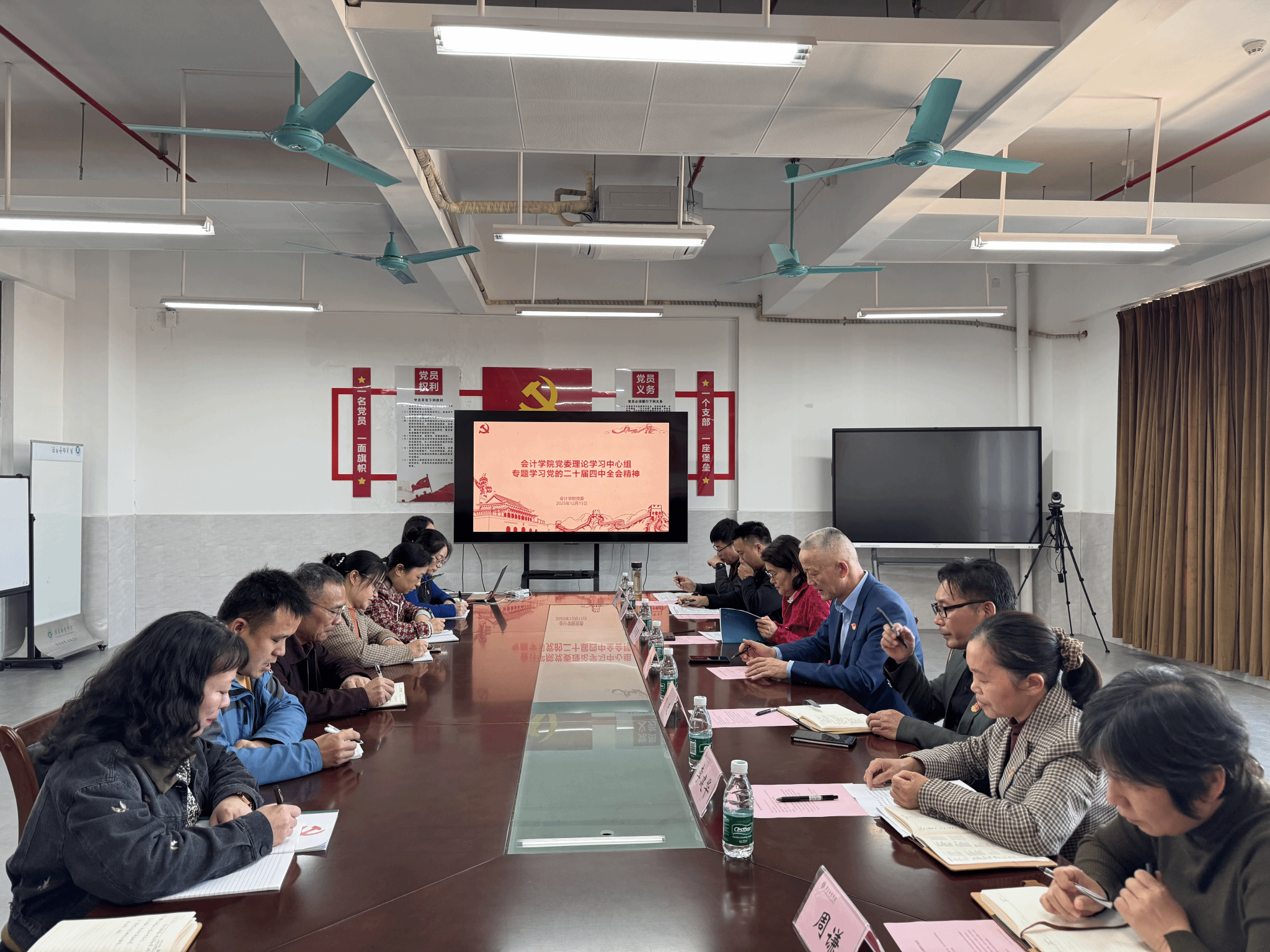 2025年12月15日下午,会计学院党委理论学习中心组在致用楼1315召开党的二十届四中全会精神专题学习会。会议由党委书记李建华主持,校党委书记孙国忠、党委宣传部部长曾进列席旁听专题学习会,学院党政班子成员、各系主任、各党支部书记参加会议。