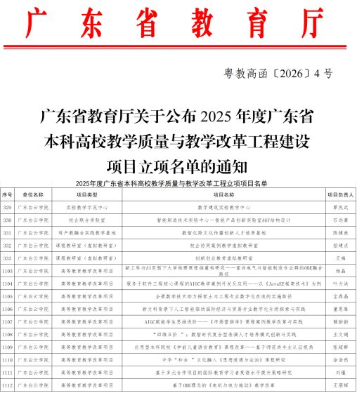 近日,广东省教育厅正式公布了2025年度本科高校教学质量与教学改革工程项目立项名单。我校共15个项目获批立项,涵盖实验教学示范中心、校企联合实验室、科产教融合实践教学基地、课程教研室(虚拟教研室)以及高等教育教学改革项目等多个类别,充分展现了我校围绕区域产业升级需求,以数字化、智能化转型为抓手,深入推进应用型人才培养模式改革的前瞻布局与扎实成效。