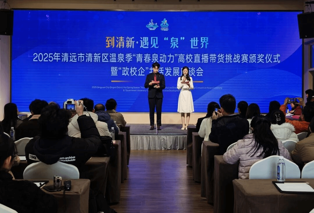 本次“青春泉动力高校直播带货挑战赛”是2025年清新区温泉季暨民宿体验活动的重要组成部分,由清远市清新区文化广电旅游体育局、清新区三坑镇人民政府主办,为期一个月,以“到清新·遇见‘泉’世界”为主题,旨在通过高校青春力量推广清新区温泉文旅资源,深化政校企协同育人模式,助力地方文旅经济发展。赛事吸引了省内外多所高校组队参赛,各团队围绕清新区温泉景区、特色民宿及地方特产开展直播带货实战比拼,经过直播策划、脚本创作、现场带货、数据复盘等多环节角逐,最终评选出各类奖项。