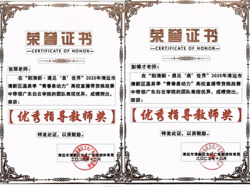 2026年1月9日,2025年清新区温泉季“青春泉动力”高校直播带货挑战赛收官。广东白云学院学子在比赛中表现突出,充分展现了扎实的专业素养与出色的实战能力,最终荣获多项荣誉:传媒学院张琛老师带领的“青泉云智”团队夺得二等奖,应用经济学院彭德才老师带领的“青春飞扬”和“相亲相爱一家人”团队获得优秀奖,两位指导老师均被评为“优秀指导教师奖”。颁奖仪式结束后,张琛老师受邀作为校方代表,参加了“政校企”交流座谈会,并在会上分享了赛事组织经验与人才培养心得,体现了学校在实践教学与产教融合方面的积极成果。