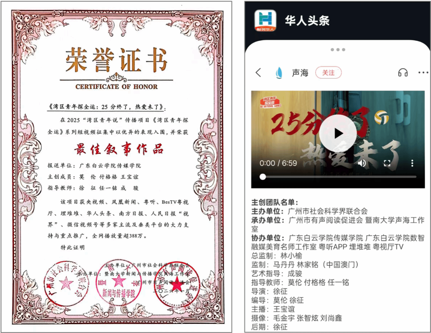 由广东白云学院数智融媒美育名师工作室主持人成骏教授任艺术指导,工作室成员莫伦、任一铭及徐征、付格格、王宝仪等传媒学院师生共同创作的纪录短片《25分终了,热爱未了》,在广州市社会科学界联合会主办、暨南大学新闻与传播学院声海工作室、广州市有声阅读促进会承办的《湾区青年探全运》传播项目系列短视频评比中,凭借细腻的叙事与鲜活的镜头语言,荣获最佳叙事作品奖!