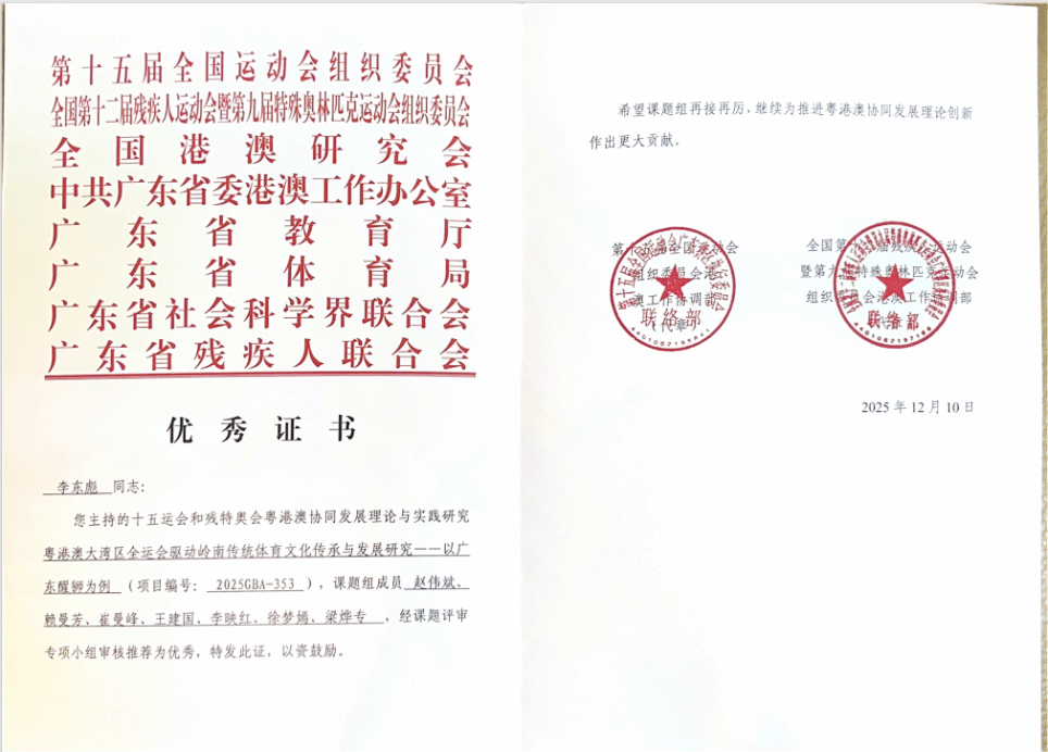 此次三项成果同时获评省级优秀,是对团队持续探索的肯定。未来,团队将继续深化体教融合,借助全运会契机,拓展粤港澳传承合作,为大湾区文化传承与思政教育注入新活力。(图文/体育学院赖曼芳、李东彪 责任编辑曾进 )
