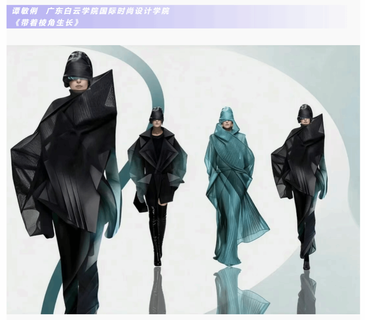 作品《带着棱角生长》以“棱角”为核心意象,巧妙将成长中的锋芒、坚守与蜕变转化为可触可感的服装语言。设计灵感源自自然与生活的双重启迪:既有破土岩芽的生机,也有建筑几何的利落,更融汇人生中那些未曾磨灭的“倔强时刻”——少年的锐气、初入职场的坚持、突破自我的勇气,均化为衣身的线条、结构的转折与细节的锐度,使服装成为承载成长叙事、传递精神态度的生动载体。