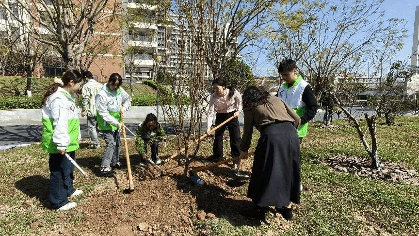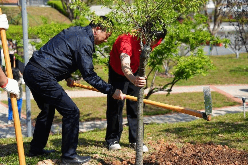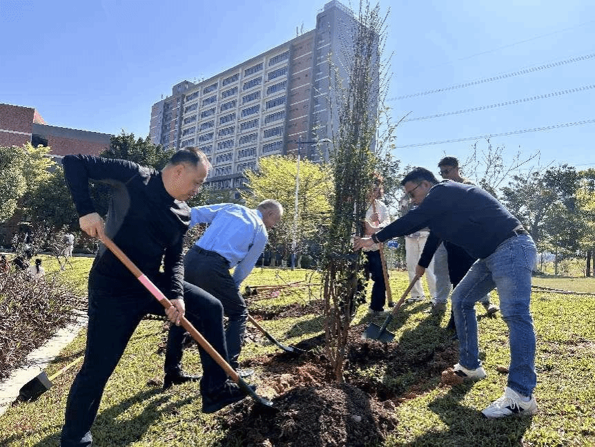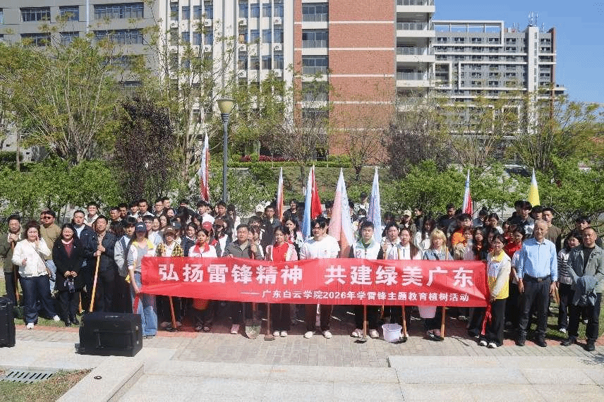春风送暖,绿意萌动。在第48个植树节到来之际,为深入践行习近平生态文明思想,牢固树立“绿水青山就是金山银山”理念,将雷锋精神与绿美广东生态建设深度融合,3月12日,我校在北校区桃李园开展“弘扬雷锋精神 共建绿美广东”学雷锋主题教育植树活动。学校党委书记孙国忠,党委副书记、副校长陈峰,总务处、学生处、团委等职能处室负责人,各二级学院党、团书记及学生志愿者齐聚一堂,以躬身实践为校园添绿,用青春行动传承雷锋精神。