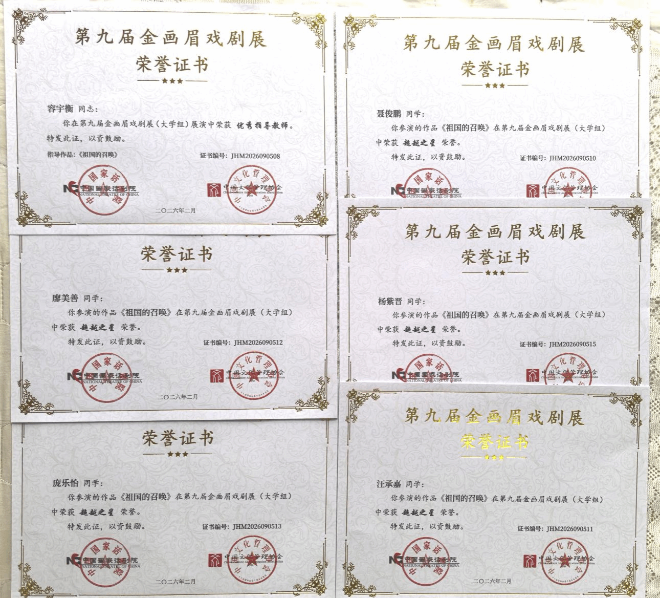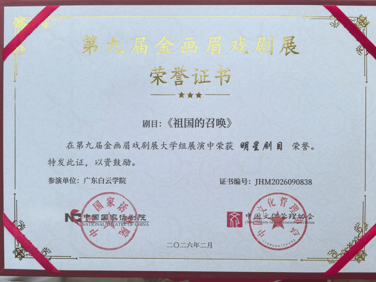 近日,由中国国家话剧院、中国文化管理协会主办的第九届“金画眉”戏剧展在北京圆满落幕。广东白云学院数智融媒美育名师工作室支持、指导的原创剧目《祖国的召唤》惊艳亮相,凭借深刻的主题内涵与精湛的舞台演绎,斩获两项荣誉!其中播音与主持艺术专业庞乐怡、汪承嘉、聂俊鹏、杨紫晋、廖美善五位同学凭借出色表现,在国家级舞台荣获演员类最高荣誉“超越之星”称号;容宇衡老师担任该剧编剧及导演,从全国众多优秀作品中一举斩获展演“明星剧目”奖;在国家级舞台展现了学校在美育与思政教育融合发展中的丰硕成果。