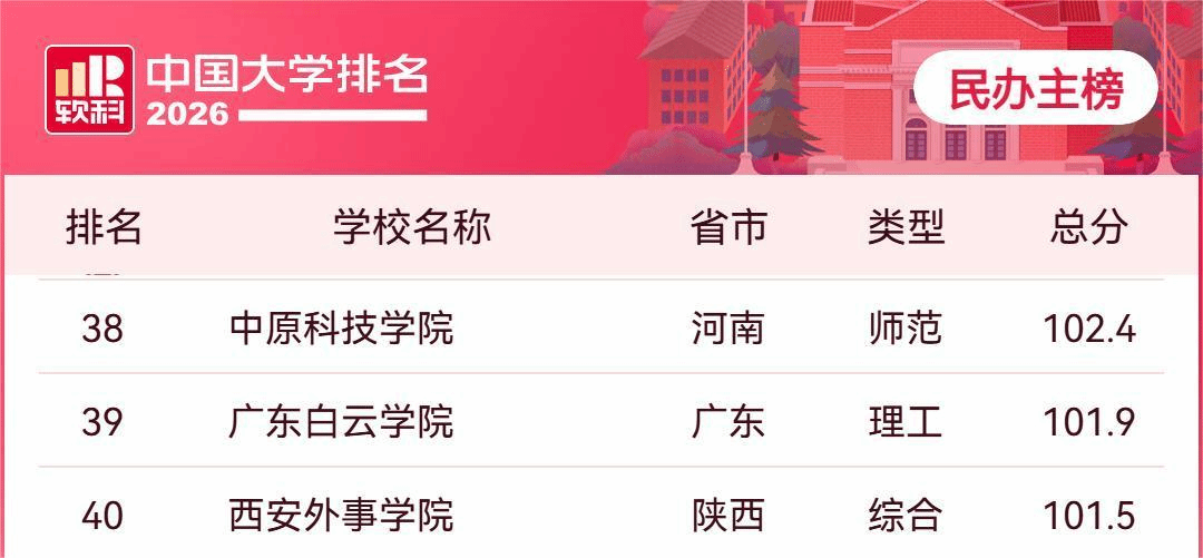 4月15日,高等教育专业评价机构软科正式发布“2026软科中国大学排名”。广东白云学院获评“2026软科中国民办高校排名”全国百强榜单(第39名),位居广东民办高校榜单第5名,名列广东民办高校理工类第2名,持续位居民办高校前列。
