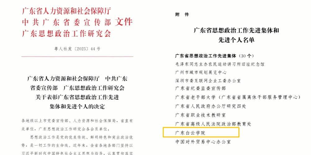 长期以来,学校坚持社会主义办学方向,全面贯彻党的教育方针,落实立德树人根本任务,坚守为党育人、为国育才初心使命。以服务国家战略和粤港澳大湾区经济社会发展需求为己任,致力于培养具有家国情怀、人文素养、工匠精神、创新能力和国际视野的复合型应用型人才。学校先后被评为广东省先进基层党组织、党建“双创”示范高校,、“三全育人”体制机制建设试点单位、“两新”组织党建工作示范点,荣获全国民办高校先进单位,3次荣获全国民办高校党建和思政工作优秀成果一等奖。基层党组织入选全国及广东省党建工作样板支部、标杆院系等,立项数量20项,居广东民办高校首位。2025年,学校获得“广东省思想政治工作先进集体”称号。