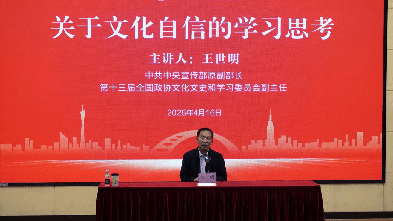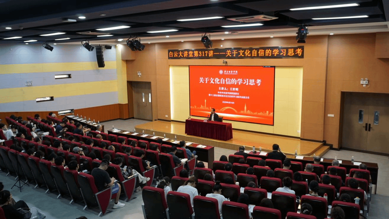 为深入学习贯彻习近平文化思想,增强青年学生对中华优秀传统文化的认同感与自豪感,广东白云学院第317讲白云大讲堂于4月16日上午在北校区明德楼107报告厅隆重开讲。本期大讲堂特邀中共中央宣传部原副部长、第十三届全国政协文化文史和学习委员会副主任王世明为我们带来主题为《关于文化自信的学习思考》的专题讲座,带领现场师生深入探寻中华万年文化史的精神根脉与时代价值。