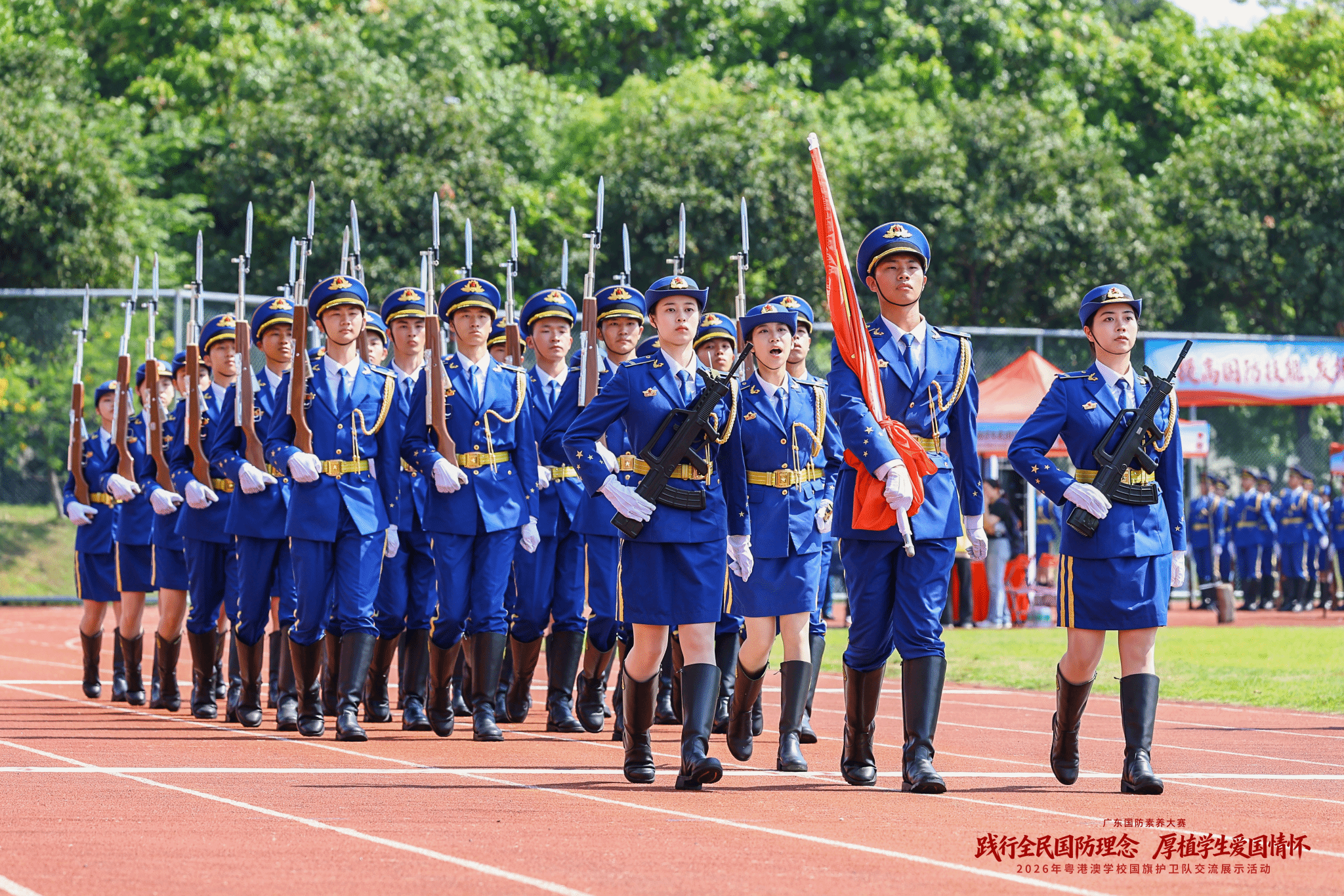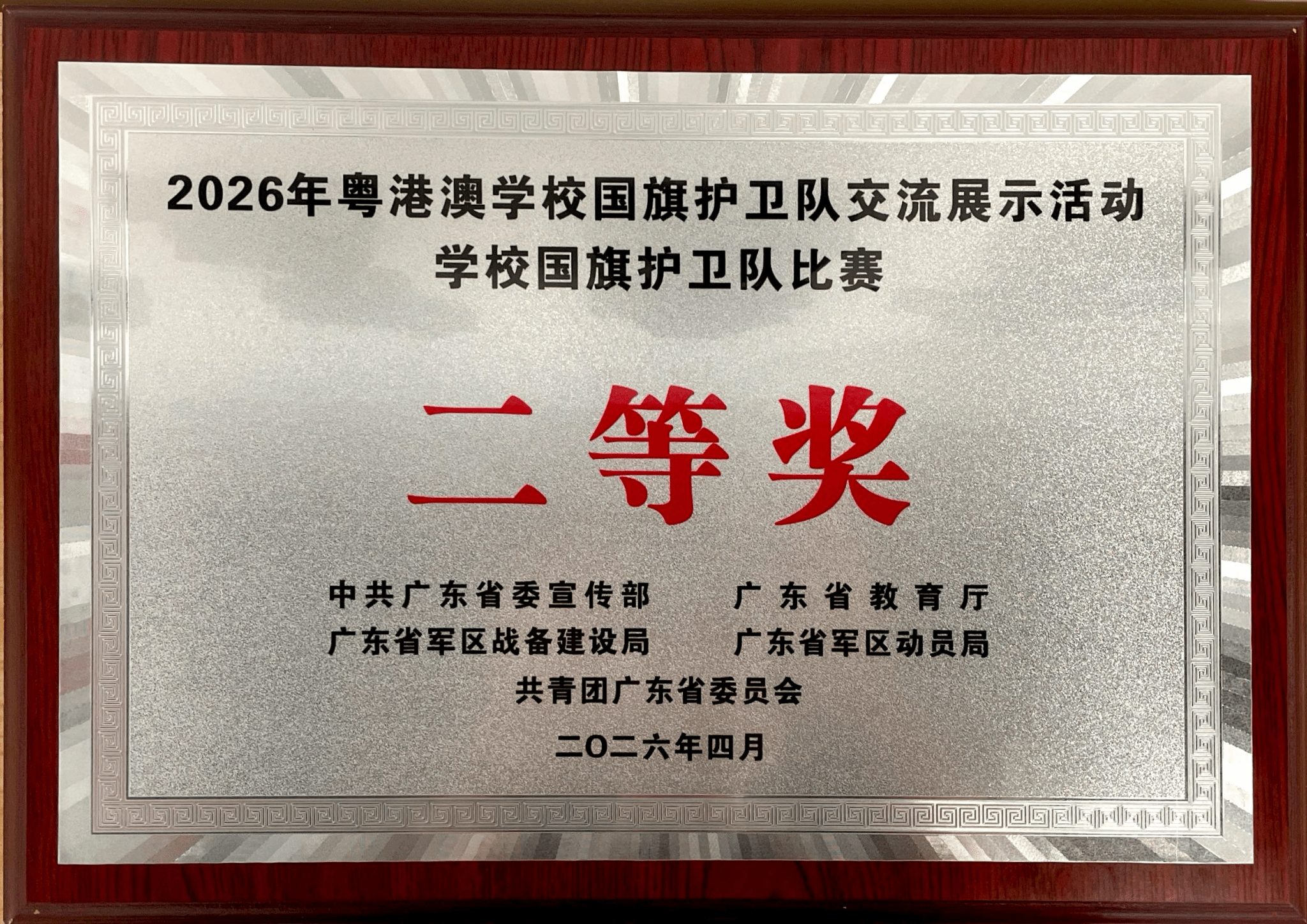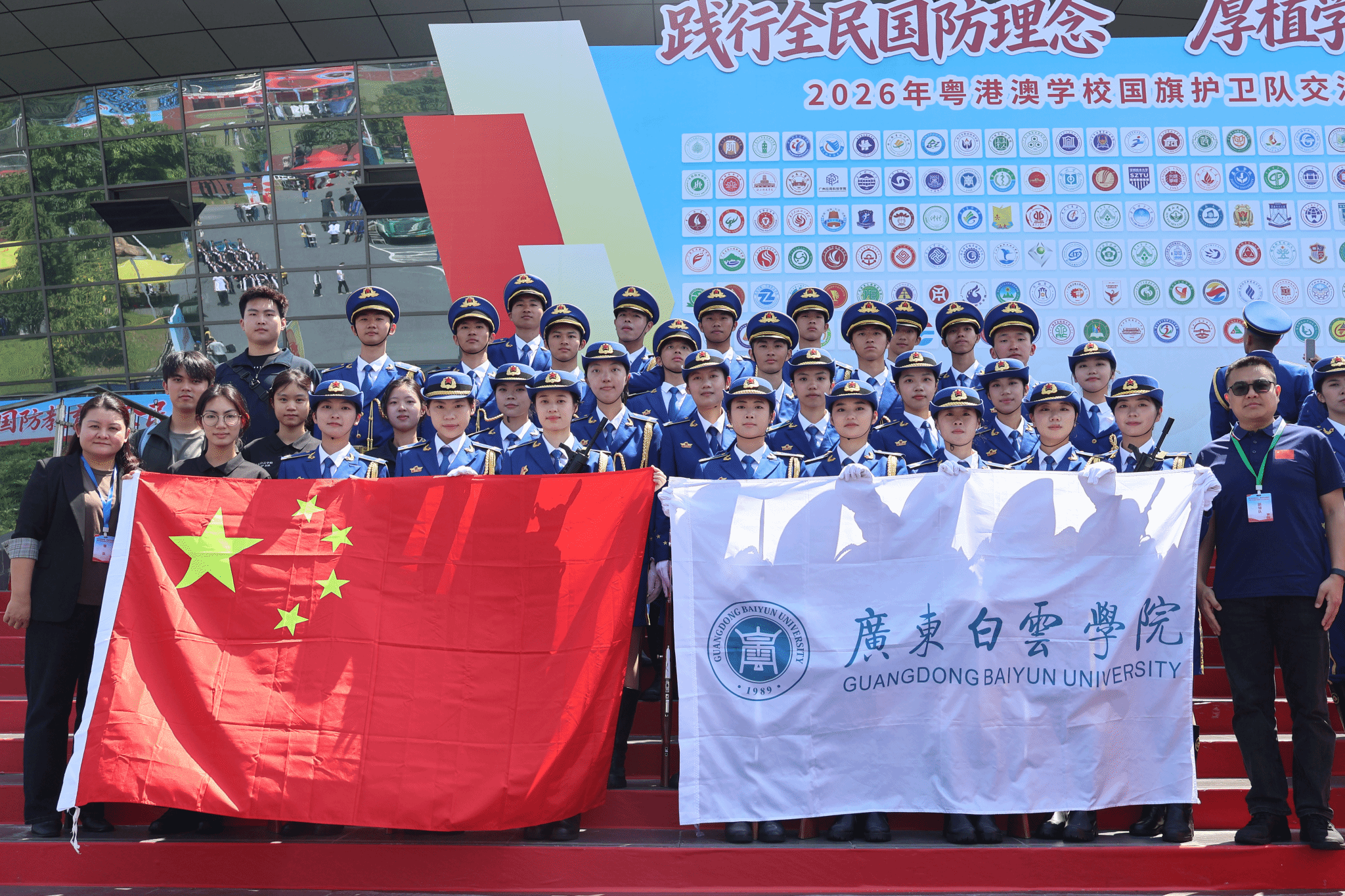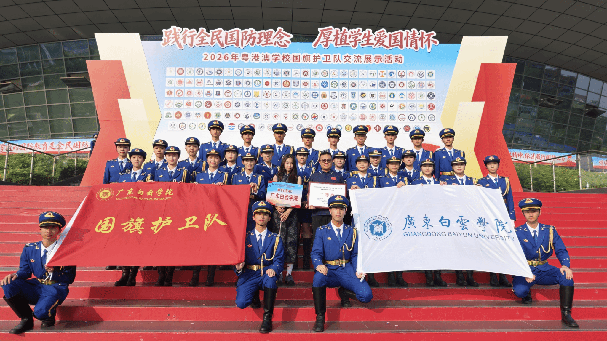 近日,由中共广东省委宣传部、广东省教育厅、广东省军区战备建设局、广东省军区动员局、共青团广东省委员会等单位联合主办的2026年粤港澳学校国旗护卫队交流展示活动于佛山大学圆满落幕。本次活动中,粤港澳三地共178所学校、逾7000名师生参与竞技。广东白云学院国旗护卫队凭借过硬的军事素养与出色的现场表现,从众多参赛队伍中脱颖而出,荣获本科组“二等奖”。