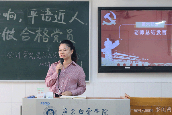 最后,第三学生党支部书记冯绮玲老师总结发言。她强调作为学生党员,应当努力提升思想道德修养和科学文化素养,时刻反思自己,正视自己的优缺点;并号召大家要多多了解时事,例如港珠澳大桥的开通、习近平总书记到广东视察等热点事件,进一步增强自身使命感和责任感,更好的发挥党员的先锋模范作用。
