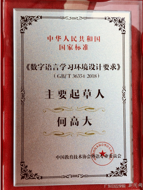 近日,国家市场监督管理总局和中国国家标准化管理委员会共同发布了《数字语言学习环境设计要求(GB/T36354-2018)》国家标准,标准将于2019年1月1日正式实施。本标准规定了语言实验室和同声传译实验室的环境要求、功能要求、性能要求和安全性要求。应相关部门邀请,我校外国语学院何高大教授作为主要起草人参与了这项起草标准的工作。(图文/外国语学院郭晓琳)