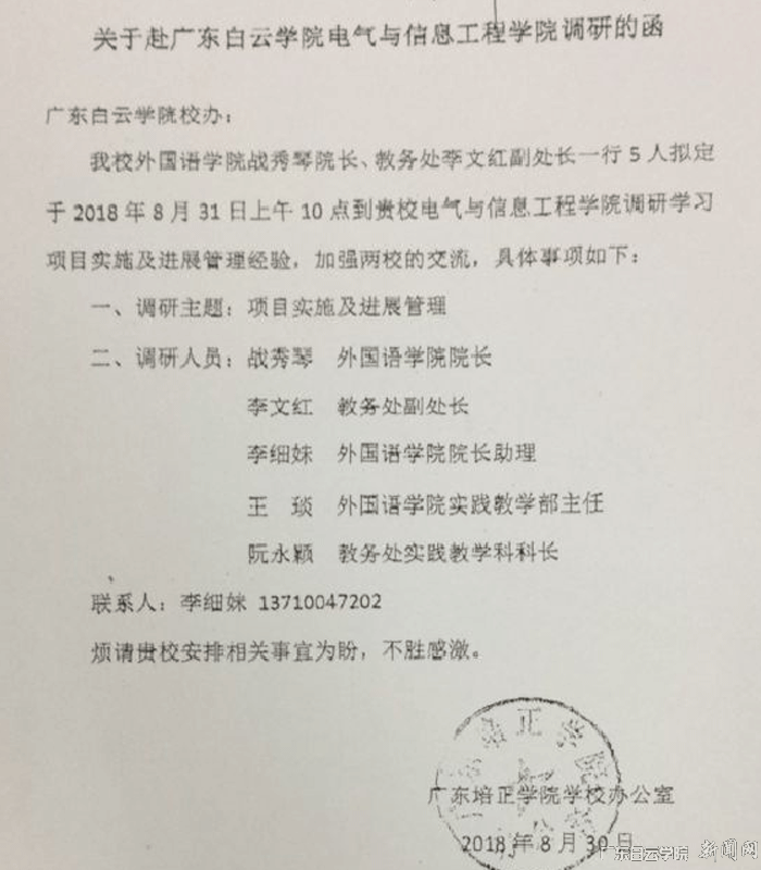 8月31日上午,广东培正学院外国语学院院长战秀琴、教务处副处长李文红、外国语学院院长助理李细妹、外国语学院实践教学部主任王琰、教务处实践教学科科长阮永颖一行5人,来到我校关于项目实施及进展管理进行交流,我校电气与信息工程学院院长林春景接待了战秀琴院长一行人。