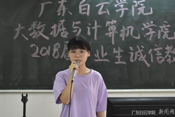 接下来,在党总支组织委员邓强的组织下,2018届贷款毕业学生当场签订贷款协议书。邓强老师向2018届未完成还贷的毕业生承诺,学校不会暂扣其毕业证及学士学位证。这充分反映了我校对国家学生贷款相关政策的高度配合,展现了我校对白云学子能做到诚信贷款的高度自信。随后,由2016级计算机科学与技术3班的黄丽纯带领在场学生进行诚信宣誓,要求学生形成良好的道德观念,以信为本,以诚立身。