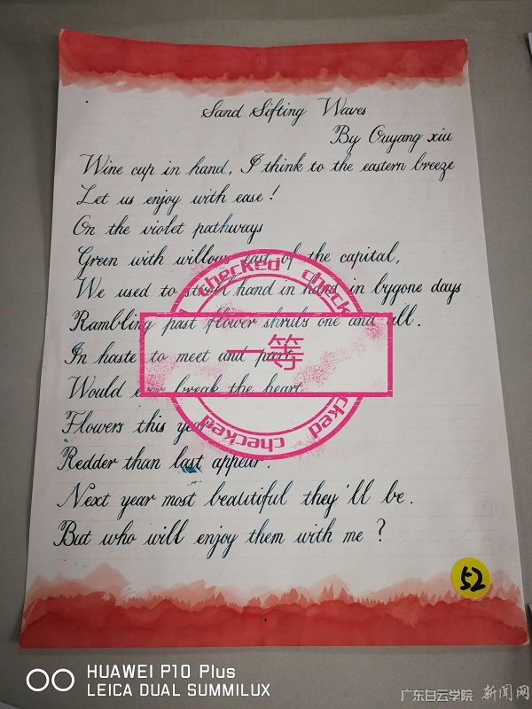 近日,由外国语学院大学英语教学部承办的第二课堂活动——广东白云学院首届“最美春天”英语诗词书法大赛圆满结束。本次大赛目的让同学们借春天的情怀,学习中英文诗词,并进行书写,在规范英文书写的同时,提高英语的知识素养和审美。