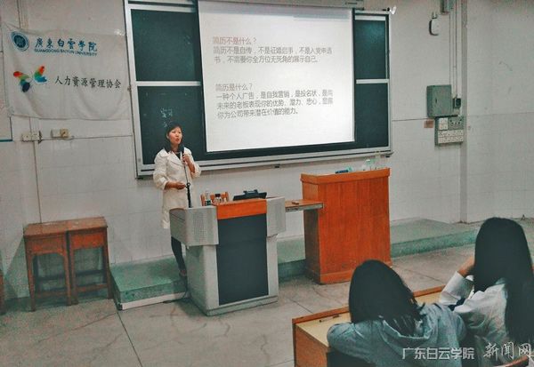 4月9日晚,广东白云学院第五届“勇往职前”校园模拟招聘竞赛之简历制作技巧培训讲座于思齐楼206教室举办,此次举办培训讲座的目的是提高同学们制作精美简历的能力,并且为未来的求职生涯打好基础。此次培训讲座特别邀请人力资源系专业老师袁捷老师为同学们讲解简历制作的技巧。